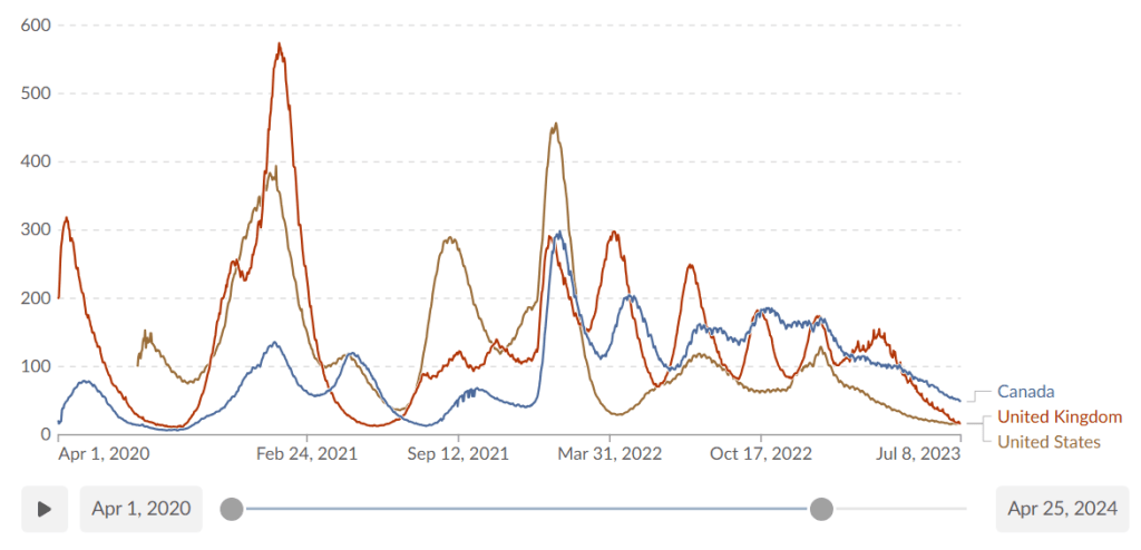 This nonsense came to prominence recently during the COVID-19 outbreak. Now I have my doubts about me wearing a mask protecting me from the flu, but I have little doubt that my wearing a mask will protect others, to some extent, from me spreading the flu. In either case, my position won’t be 100 % accurate. With the flu, we are contagious for about a day before we have symptoms. Interestingly, for COVID-19, it looks like this period of contagion before symptoms show lasts 2 to 3 days. So, as a thought experiment, should your dentist wear a mask during your procedure, to protect you, her, or both? Below is the data for COVID hospitalizations for Canada, the US, and the UK.