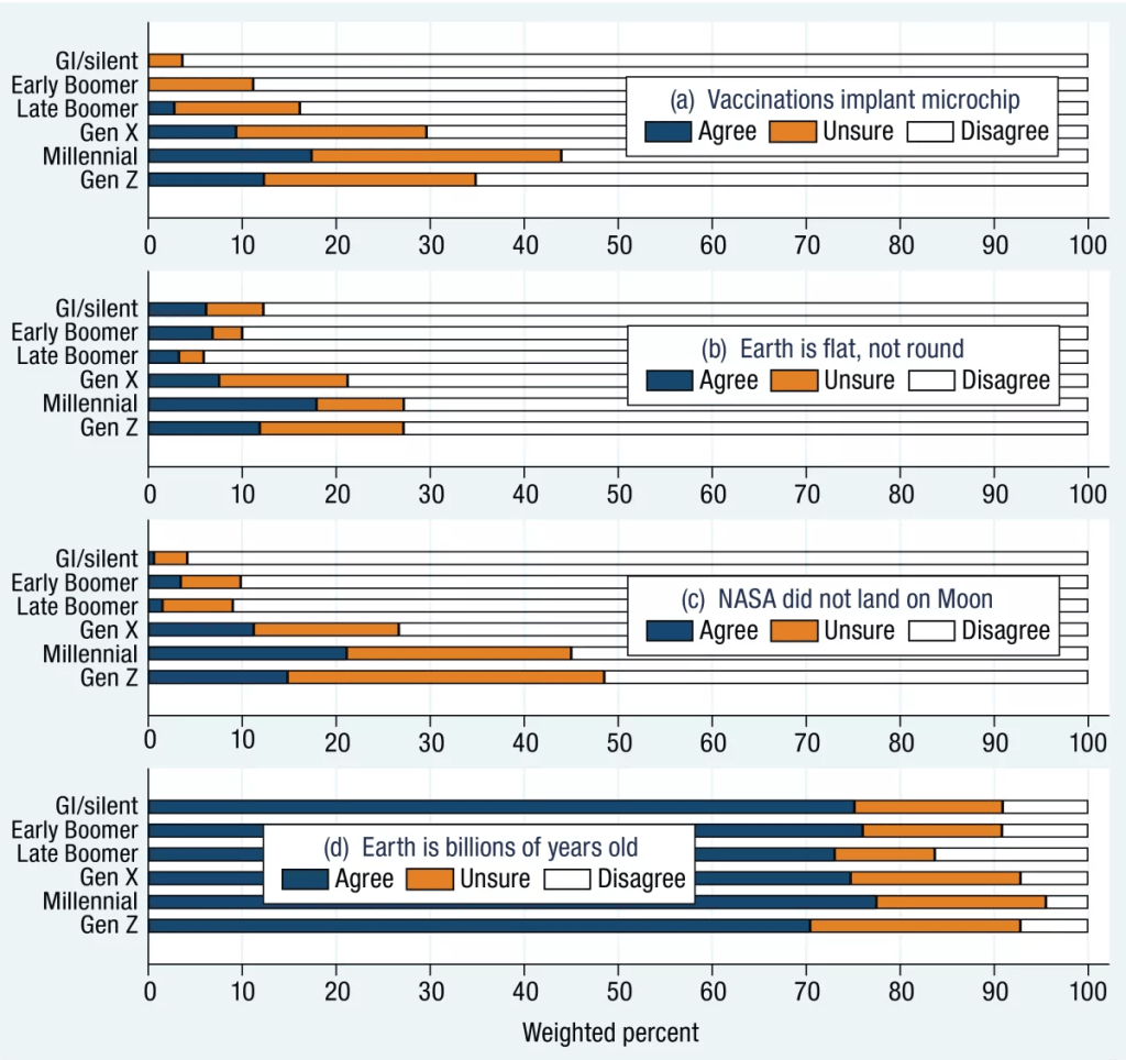 The New Hampshire study is disturbing in that it tends to be younger people who are unsure or perhaps buying into these strange beliefs. The good news is, I suppose, a young Earth seems to be purely a religious aberration, and young people as a whole have not bought into it. The study also notes that people with a conservative outlook tend to be more susceptible to conspiracy-like theories.